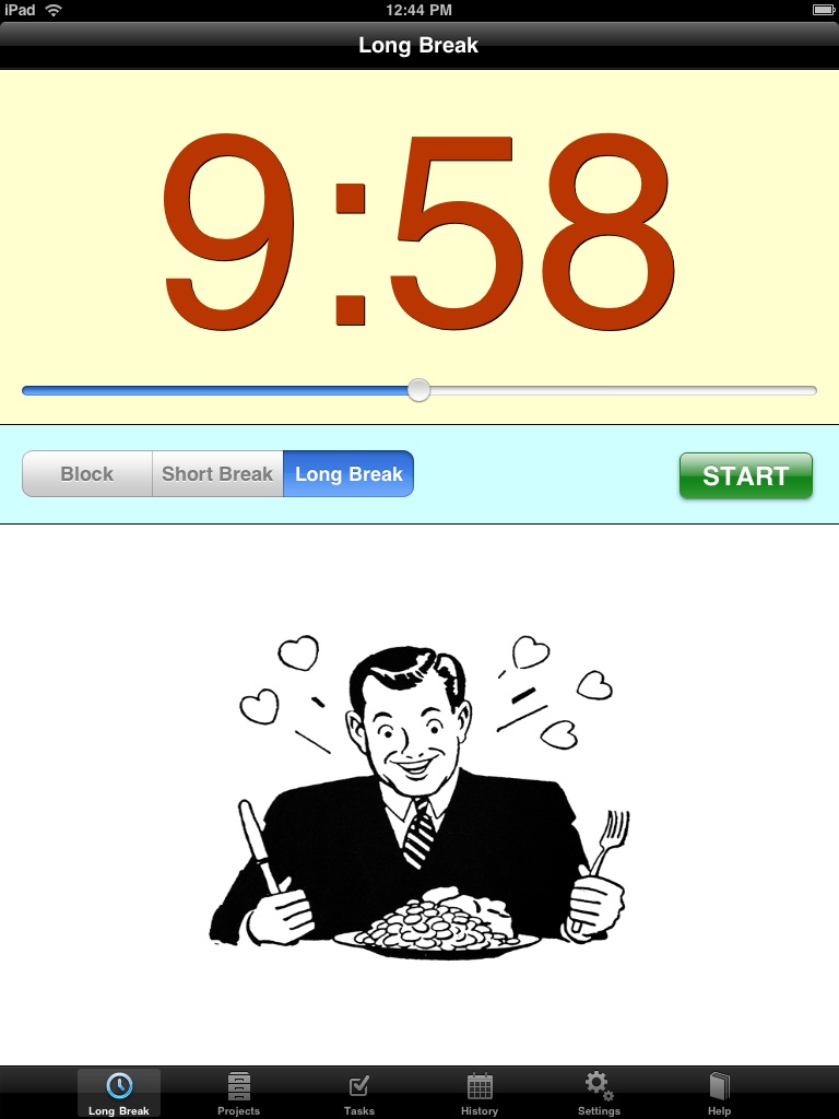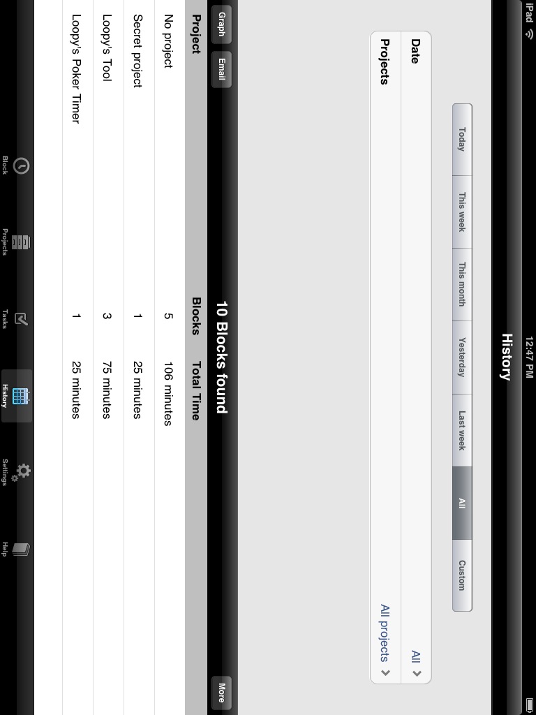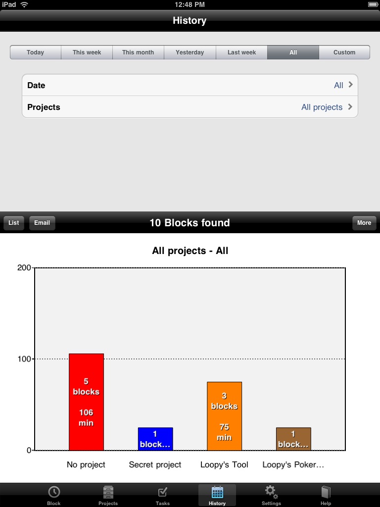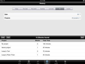 But Hocus Focus is more than just a countdown timer. Hocus Focus allows you to plan your 25 minute blocks with tasks, and assign completed blocks to projects. All completed time blocks are automatically saved and available to be viewed or edited later. The history includes each block's complete and incomplete tasks to help gauge your effectiveness. You can view a summary of time blocks as a list or bar chart and email the summary to others.