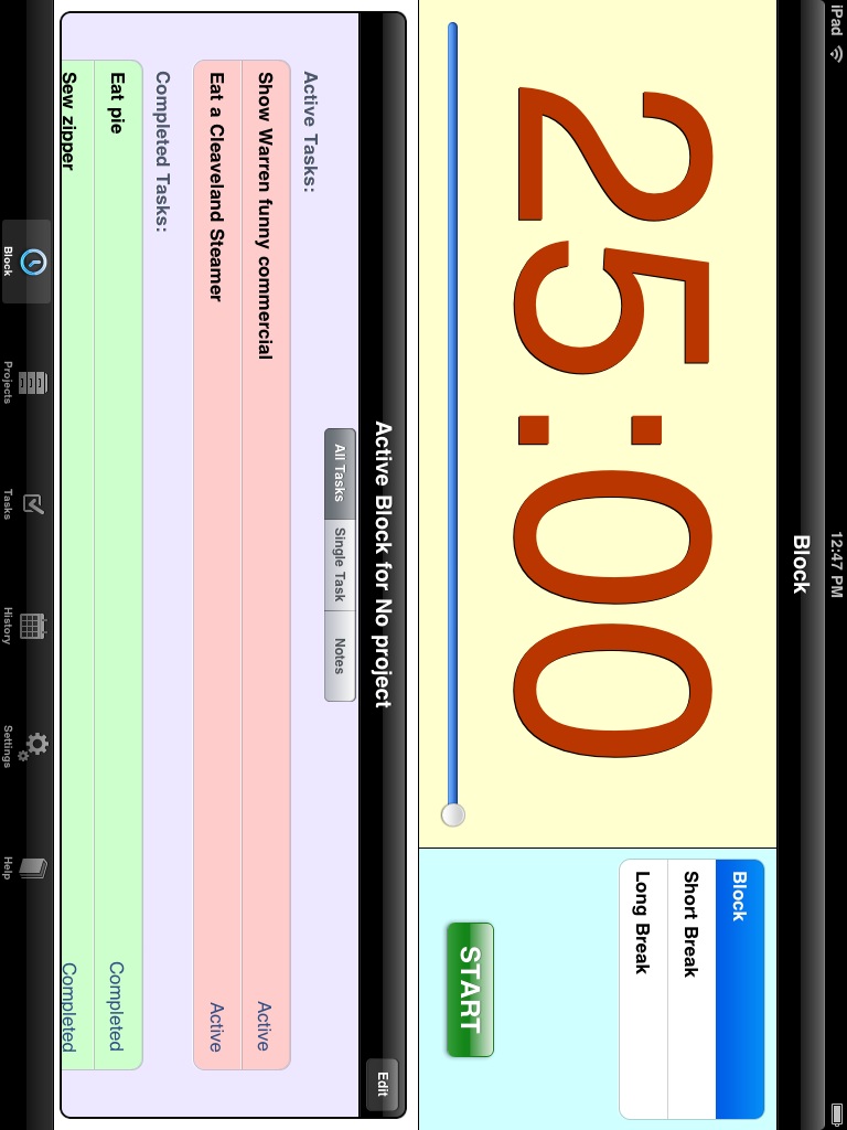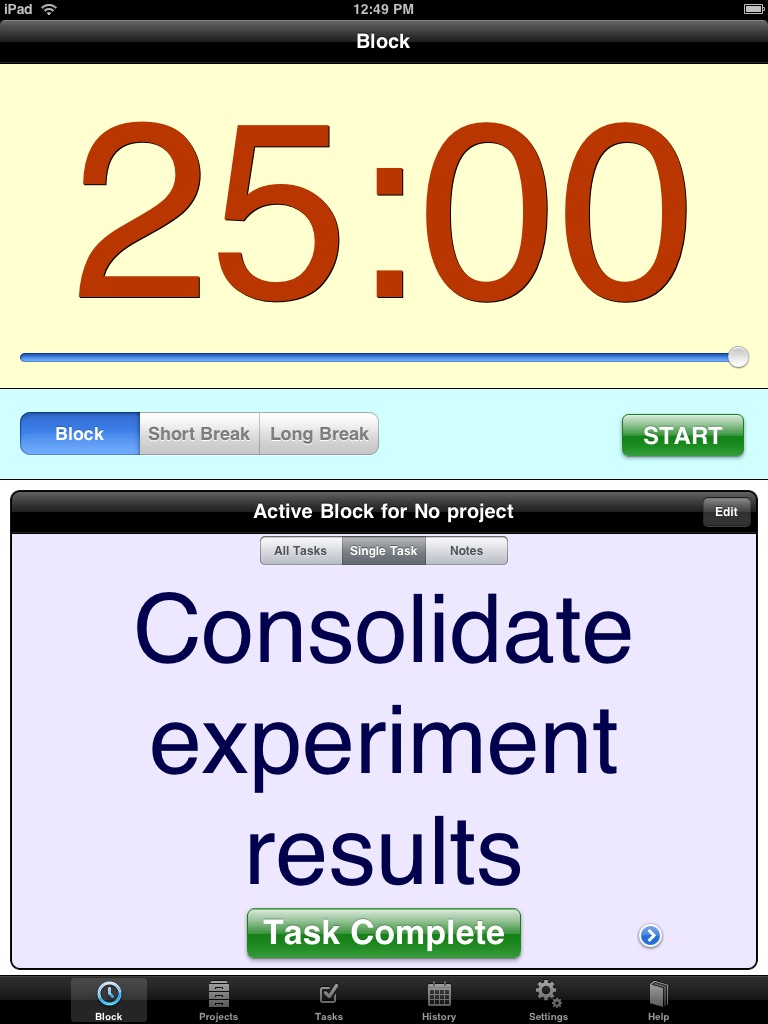 - Multiple views of Active Block: Task List, Single Task, or Notes