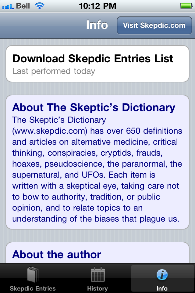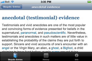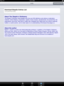 James “the Amazing” Randi calls The Skeptic’s Dictionary “first aid for psychic attacks.” Stephen Barrett of Quackwatch says that the SD “can protect many people from being scammed.” When that pesky, but lovable, friend or family member becomes infatuated with the paranormal, the supernatural, the occult, or some strange-sounding alternative to science-based medicine, your SD app can provide the antidote in an instant. With more than 650 terms to choose from, the SD app takes you on a journey from abracadabra to zombies. The SD is your one-stop source for information on weird beliefs and the critical thinking skills needed to understand and combat them.